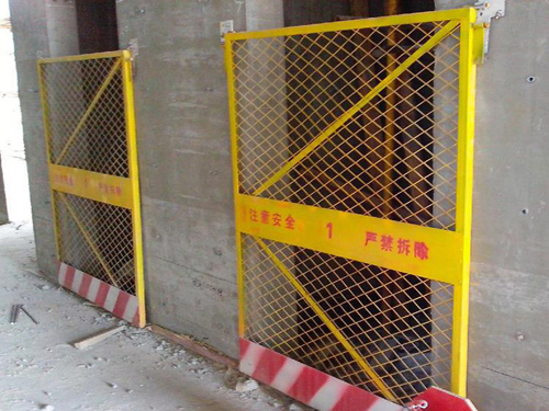 電梯井口防護門全部由鋼結構組成。鋼材采用國家標準材料,制作嚴格按圖施工,尺寸正確,焊接點牢固,達到安全防護之目的,電梯安全門采用檸檬黃色,門下部檔架板采用黃、黑間隔。電梯井口防護門是建筑施工現場預防人身傷害必備的防護設施,它適用于各類建筑施工工地。